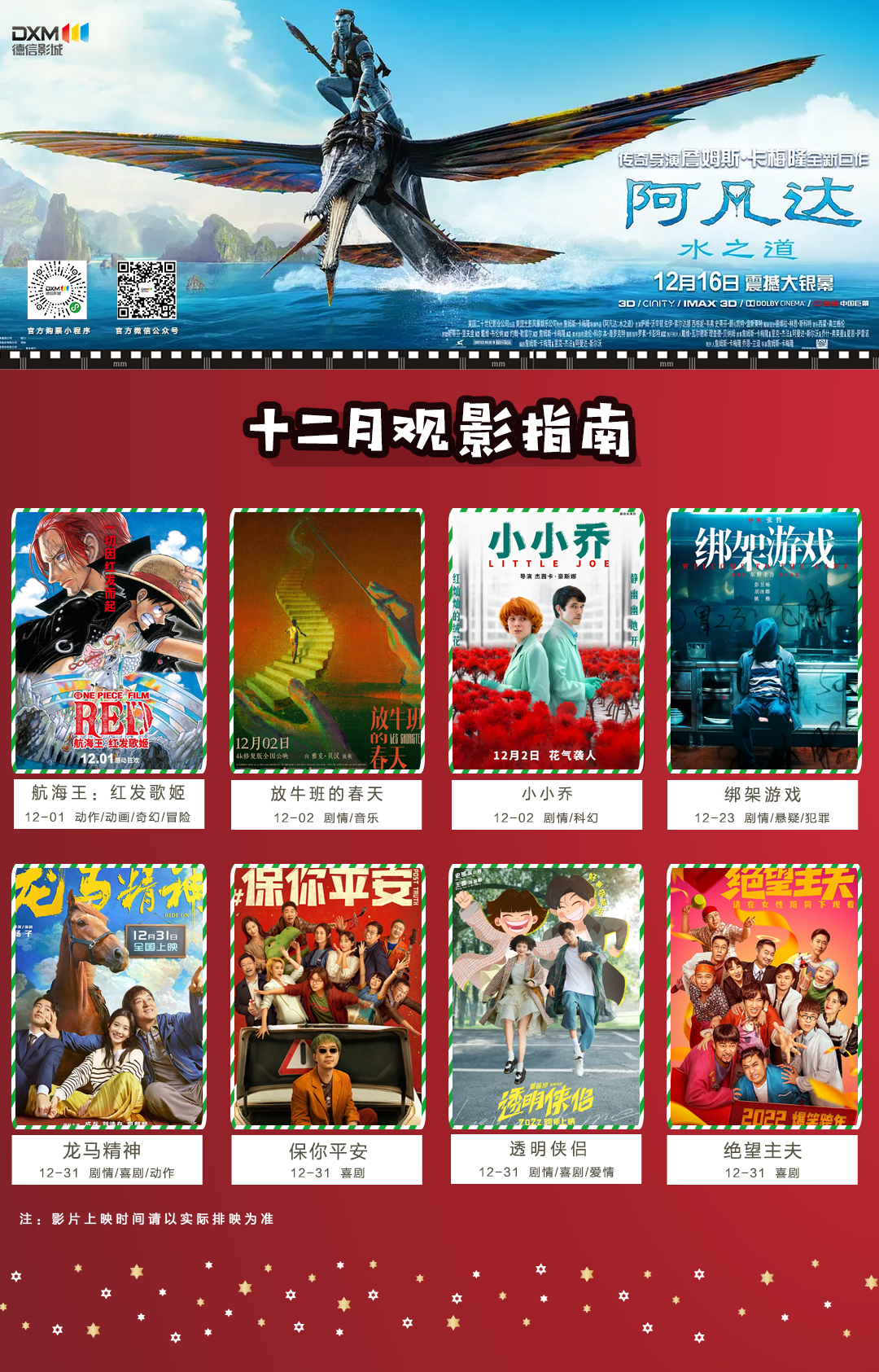 万众期待的《阿凡达2》将于12月16日震撼大荧幕!除此之外,12月更是好片齐聚,《航海王:红发歌姬》带你奇幻冒险;《放牛班的春天》经典再现,温暖师生情疗愈心灵; 《2067》讲述在地球上被气候变化破坏后,人类展望未来寻找答案的故事;还有《小小乔》、《绑架游戏》、《龙马精神》、《保你平安》、《透明侠侣》、《绝望主夫》精彩不断!这个周末,快来57365z线路检测中心影城观影吧!